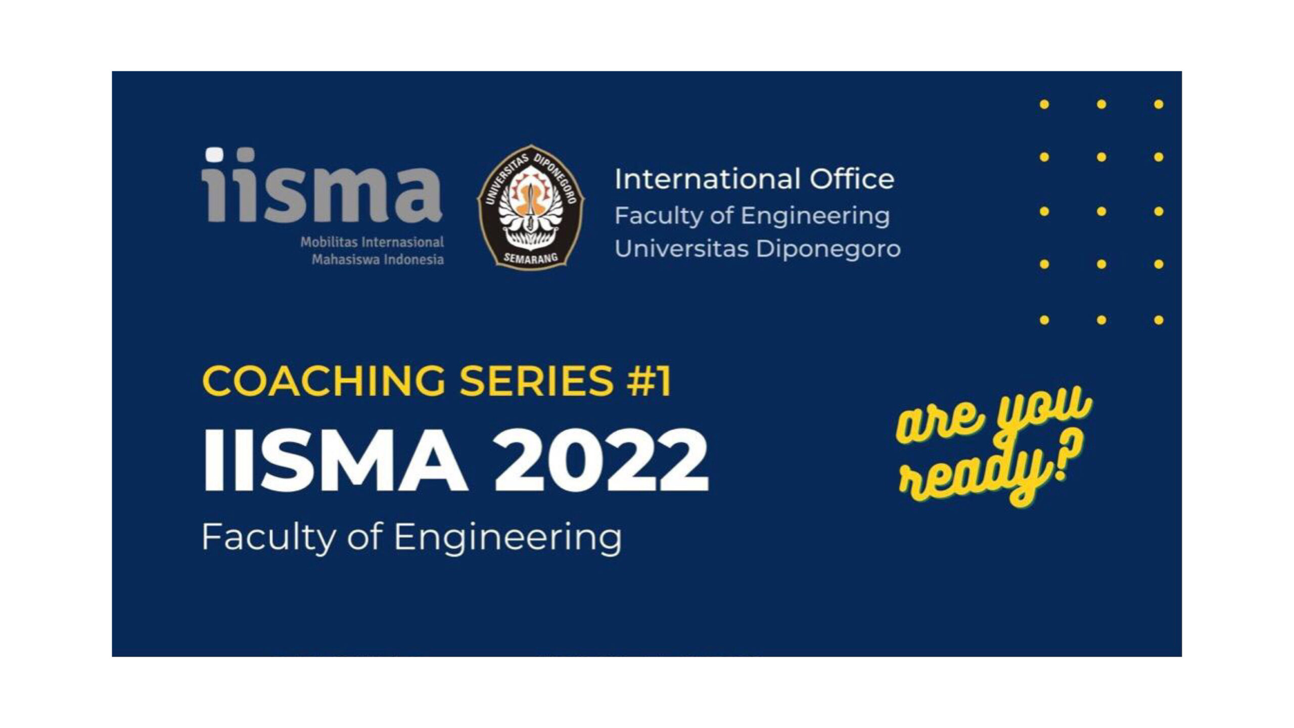 COACHING SERIES: PELATIHAN TEKNIS PENDAFTARAN IISMA TAHUN 2022 Coaching Series IISMA 2022 #1 Are You Ready? Hari/Tanggal: Sabtu, 19 Maret 2022Platform: ZoomMeeting ID: 958 0872 Pasword: 093278