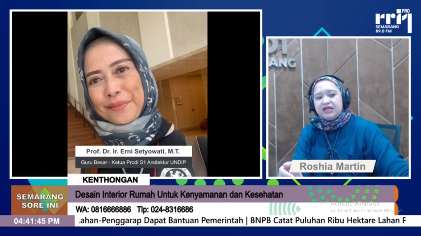 Dalam acara Dialog Kentongan Pro 1 RRI Semarang pada 21 Februari 2024, Prof. Erni menjelaskan tentang tiga aspek yang perlu diperhatikan dalam mendesain rumah agar bisa menciptakan kenyamanan dan kesehatan bagi penggunanya. Tiga aspek tersebut adalah aspek termal, aspek visual, dan aspek audial.