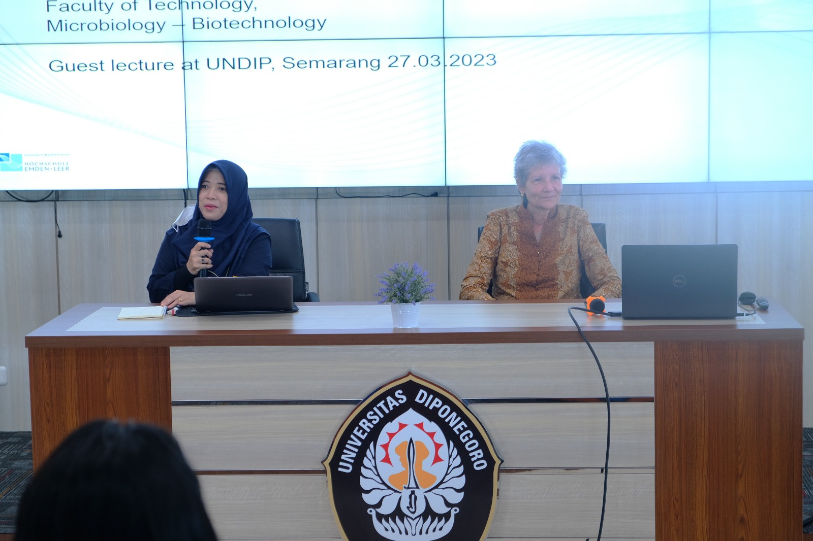 (27/3) The Department of Environmental Engineering, Faculty of Engineering, Universitas Diponegoro, conducted the International Lecture Series with the theme “The Role of Microbiology in Municipal Wastewater Treatment” at the Theatre Room, Dekanat Building 4th Floor. Prof. Dr.rer.nat.habil. Claudia Johanna Gallert from the University of Applied Science Emden Leer, Germany, was appointed as the guest lecturer. Mrs. Titik Istirokhatun, S.T, M.Sc., Ph.D. was chosen as the moderator for this open lecture. This lecture is not only attended by academics and students from the Department of Environmental Engineering but also by related studies such as the Department of Biology.