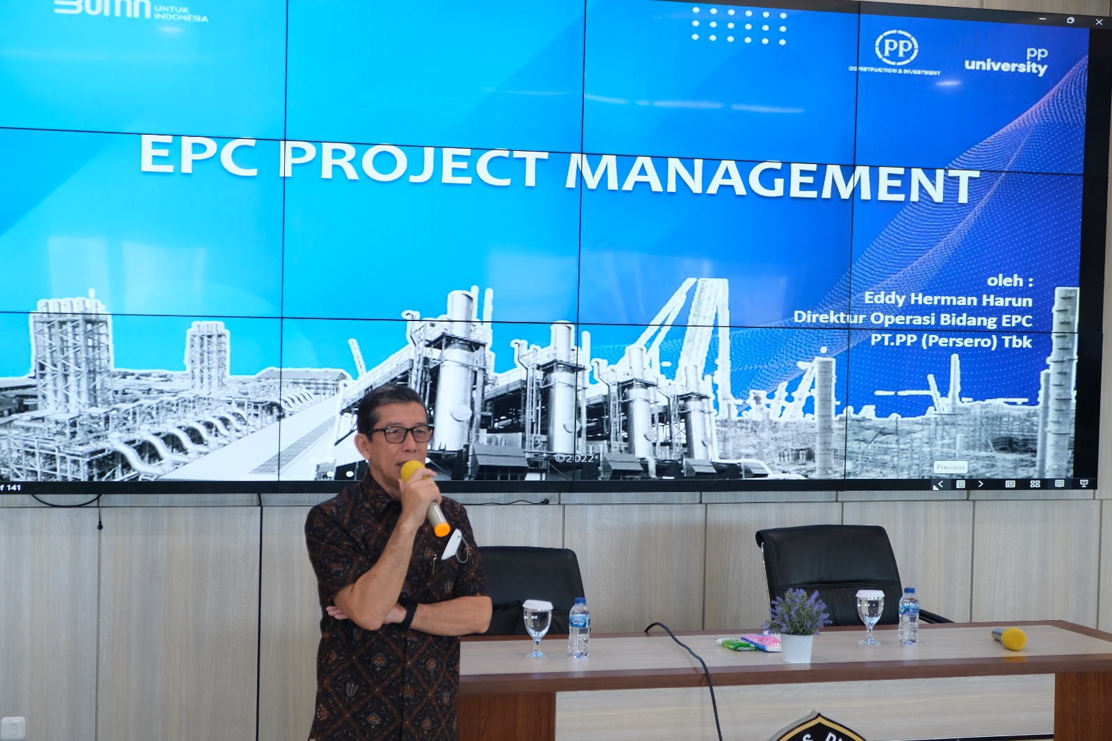 Acara kemudian dilanjutkan dengan pemaparan materi oleh Direktur Operasi Bidang EPC dari PT PP, Bapak Eddy Herman Harun. Dalam kesempatan tersebut, beliau menjelaskan berbagai hal yang terkait dengan Engineering, Procurement, and Construction (EPC). EPC merupakan salah satu bidang baru di dunia teknik yang saat ini sedang banyak digunakan oleh perusahaan-perusahaan konstruksi. Seringkali orang awam mengira bahwa perusahaan konstruksi seperti PT PP hanya berfokus pada pembangunan saja. Namun pada kenyataannya, di era sekarang, tidak hanya masalah konstruksi saja yang diurus oleh PT PP. Sektor yang lebih luas dan melibatkan banyak bidang mulai dari teknik kimia hingga teknik industri mulai digunakan dalam perencanaan pembangunan berbasis EPC. Perusahaan konstruksi sekarang juga berfokus pada hal-hal yang lebih kompleks seperti perencanaan dari hulu hingga hilir serta manajemen dalam penyediaan barang dan jasa terkait pembangunan dan pengelolaan bangunan tersebut. Sebagai direktur di bidang EPC, Bapak Eddy menjelaskan tentang peluang karir yang ada dalam bisnis EPC ini, terutama untuk para mahasiswa di Fakultas Teknik.
