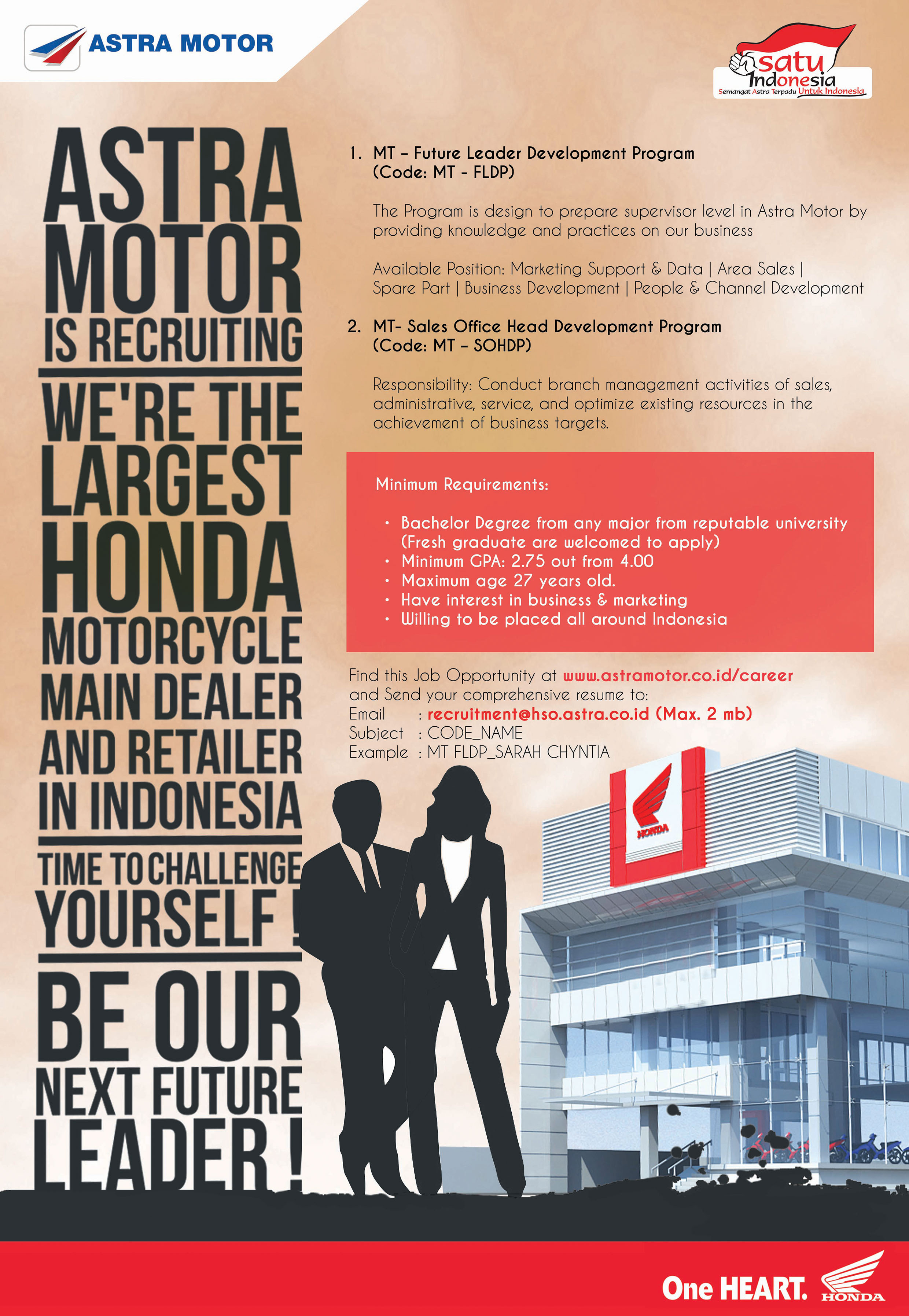 Perusahaan Astra Motor Membutuhkan Kandidat Kandidat untuk beberapa Posisi :