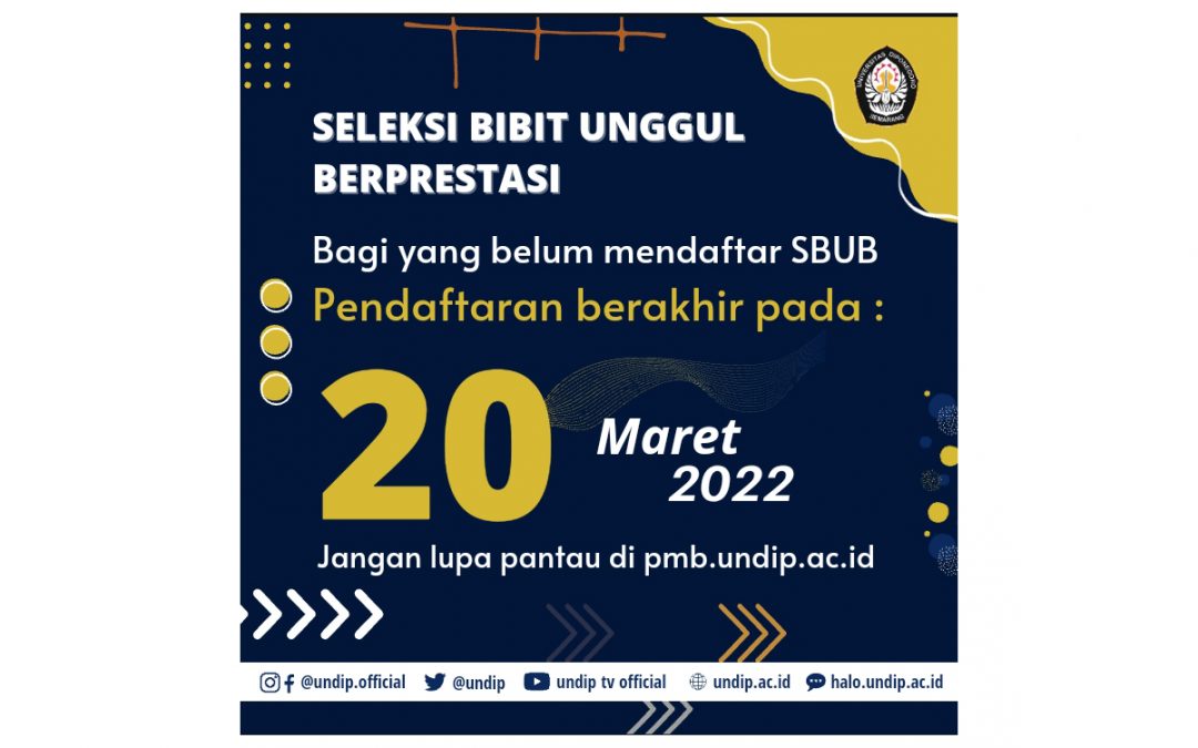Semarang-Universitas Diponegoro membuka kesempatan kepada siswa berbakat dan berprestasi untuk mendaftar melalui jalur Seleksi Bibit Unggul Berprestasi (SBUB). Pendaftaran calon mahasiswa Undip melalui jalur SBUB dibuka hingga 20 Maret 2022. “Kami memahami bilamana dalam 2 tahun ini, event kejuaraan sangat terbatas. Nah, kami menginfokan bagi siswa bahwa di Undip membuka jalur pendaftaran bagi siswa berbakat. Segera mendaftar, pendaftaran melalui jalur SBUB dibuka sampai dengan 20 Maret 2022.”, terang Dr. Paramita Prananingtyas, S.H., L.L.M. yang saat ini menjabat sebagai Sekretaris Lembaga Pengembangan dan Penjaminan Mutu Pendidikan (LP2MP) Undip dalam wawancara pada Rabu (9/3/2022).