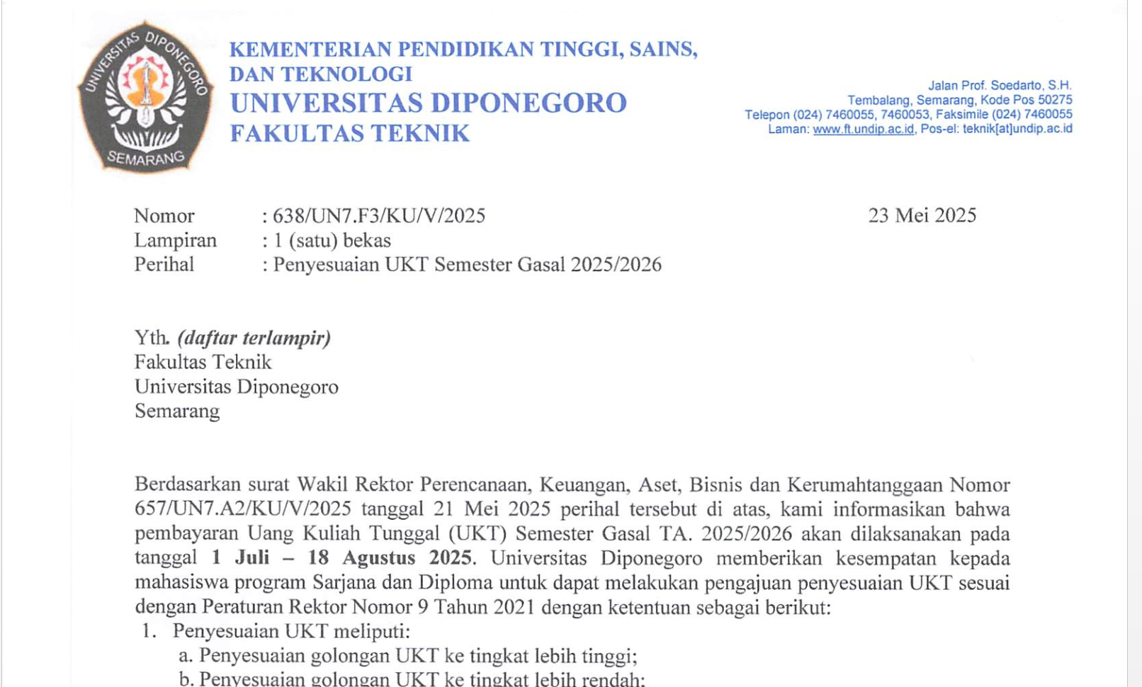 Berdasarkan Surat dari Dekan Fakultas Teknik Universitas Diponegoro No. 638/UN7.F3/KU/V/2025 dan Surat dari Wakil Rektor Perencanaan, Keuangan, Aset, Bisnis, dan Kerumahtanggaan Universitas Diponegoro No. 657/UN7.A2/KU/V/2025 tentang Penyesuaian UKT Semester Gasal 2025/2026, kami sampaikan bahwa pembayaran UKT Semester Gasal 2025/2026 akan dilaksanakan pada 1 Juli – 18 Agustus 2025.