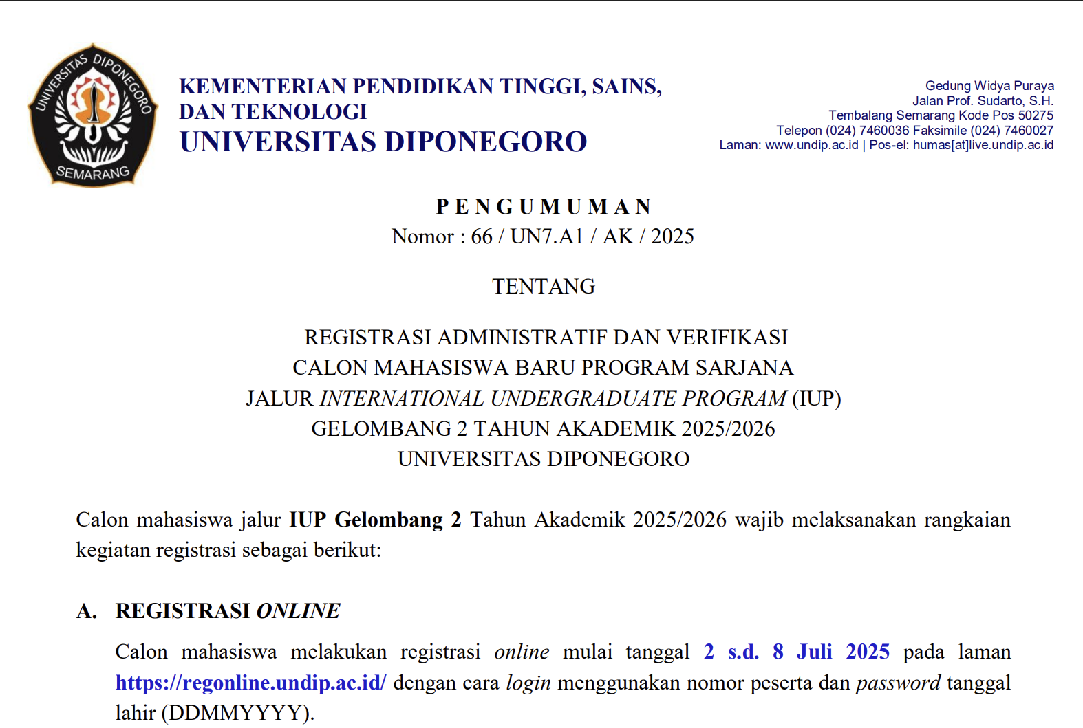 - Hasil verifikasi berkas akan diumumkan pada tanggal 10 Juli 2025 melalui laman regonline.undip.ac.id.