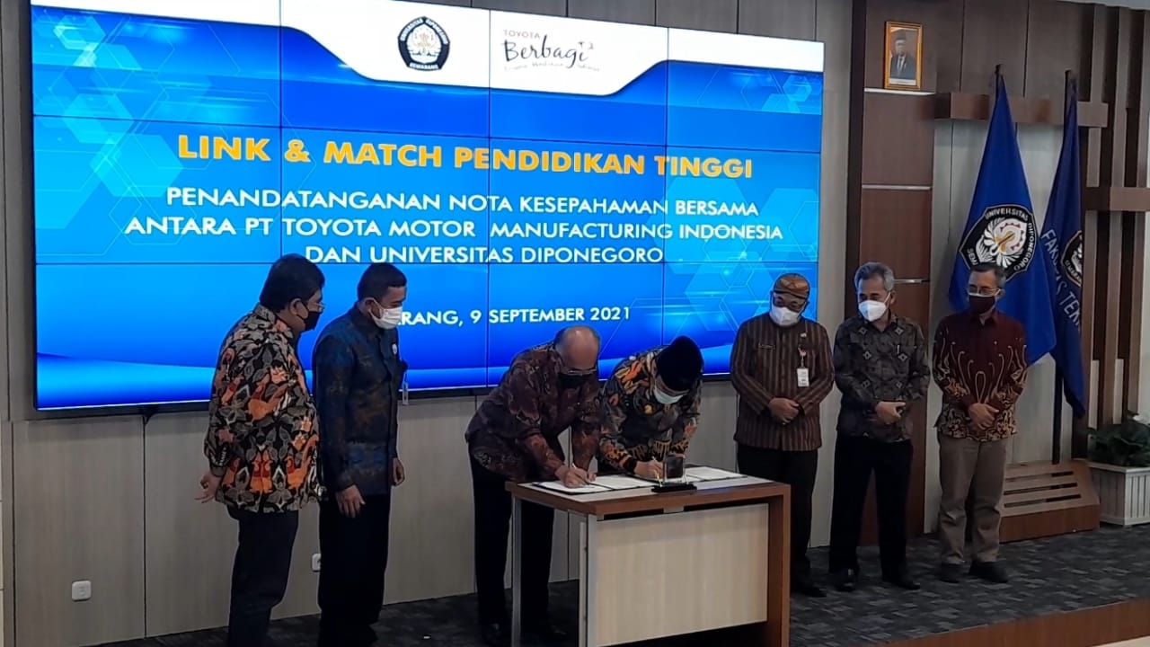 (9/9) Semarang – Universitas Diponegoro jalin kerjasama dengan PT Toyota Motor Manufacturing Indonesia (TMIIN) melalui Program Link and Match Perguruan Tinggi dan Industri. Acara penandatanganan MoU kerjasama tersebut diadakan di Ruang Theatre Lantai 4, Gedung Dekanat Fakultas Teknik Undip. Hadir dalam acara ini Rektor Undip, Prof. Dr. Yos Johan Utama dan Wakil Rektor Bidang Riset dan Inovasi Prof. Ambariyanto, Dekan Fakultas Teknik Prof. Ir. Moch. Agung Wibowo, Presiden Direktur TMMIN Warih Andang Tjahjono dan Direktur Corporate Affairs Bob Azam serta Perwakilan Pemprov Jateng Muhammad Arif Sambodo, M.Si.
