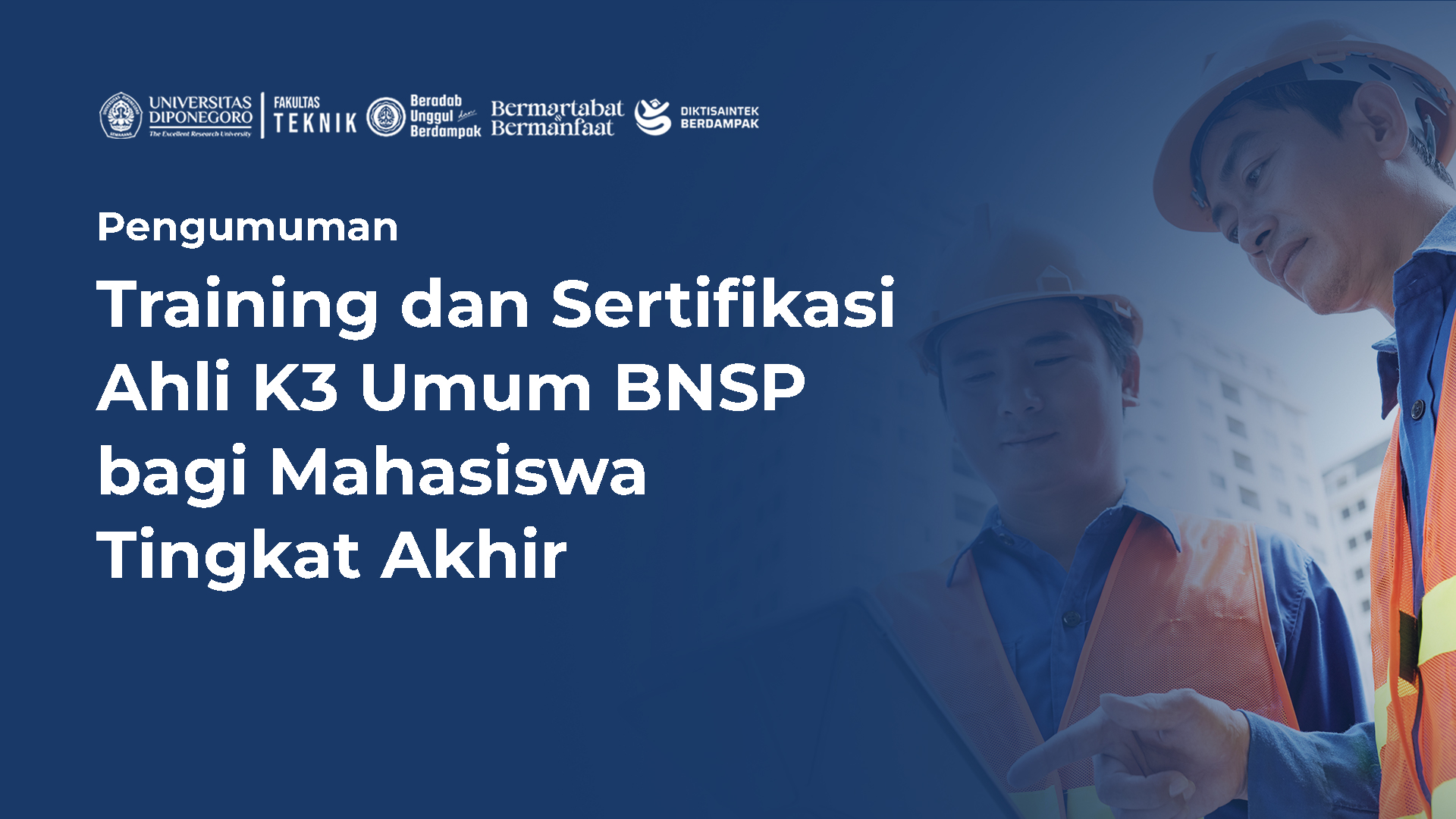 Menindaklanjuti Surat dari Wakil Dekan Akademik dan Kemahasiswaan Fakultas Teknik Universitas Diponegoro No. 186/UN7.F3.1/KM/IX/2025 tanggal 8 September 2025 tentang Kegiatan Training dan Sertifikasi Ahli K3 Umum BNSP bagi Mahasiswa Tingkat Akhir, dengan ini kami umumkan bahwa Fakultas Teknik Universitas Diponegoro bekerja sama dengan PT Wealthindo Putrapramesti Perkasa akan menyelenggarakan kegiatan Training dan Sertifikasi Ahli K3 Umum BNSP bagi mahasiswa tingkat akhir pada semester gasal 2025/2026 dan sedang dalam tahap penyusunan tugas akhir.